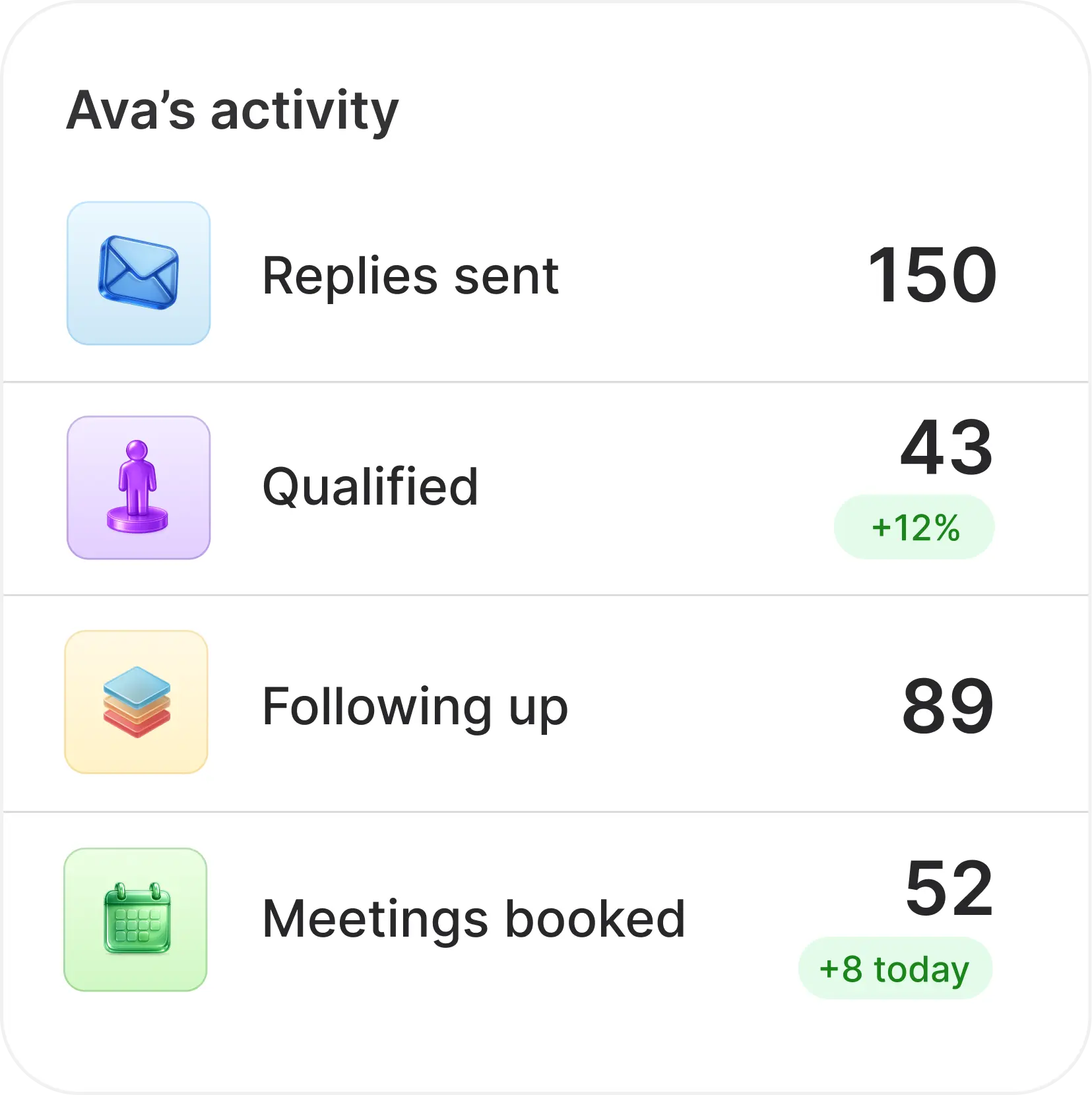 The average sales team takes 42 hours to respond to a lead. Ava responds in minutes. Unlike meeting scheduling software, Ava handles replies, overcomes objections, and books meetings on her own.